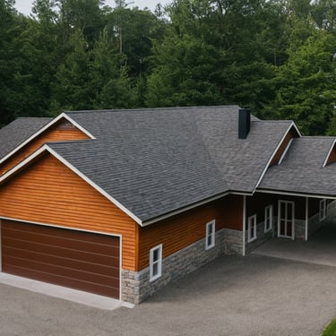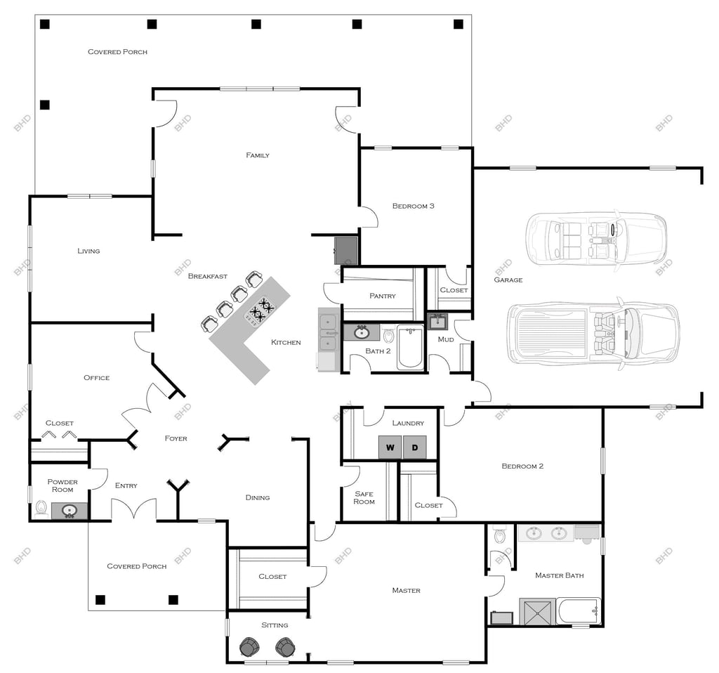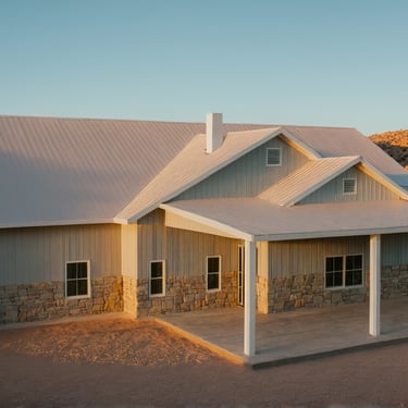 Innovative single-story, dramatic entryway with contemporary angles, open kitchen, and expansive wraparound, covered patio. Multiple roof designs available & configurable exterior finishes.