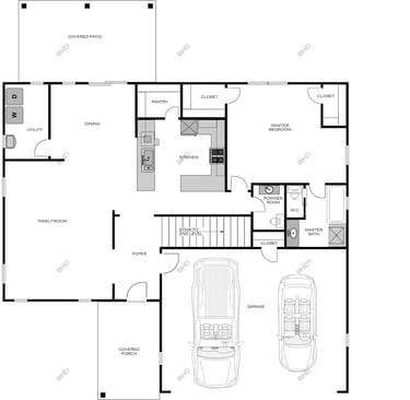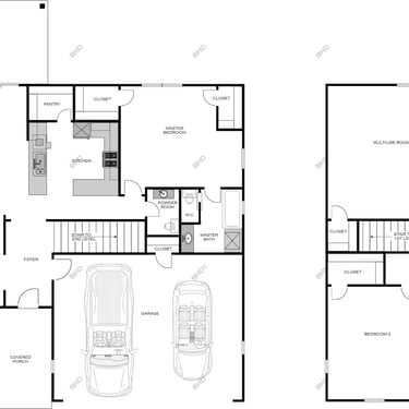 Efficient two-story family home, large multi-use room upstairs, ample storage & covered patio. Multiple roof designs available & configurable exterior finishes.