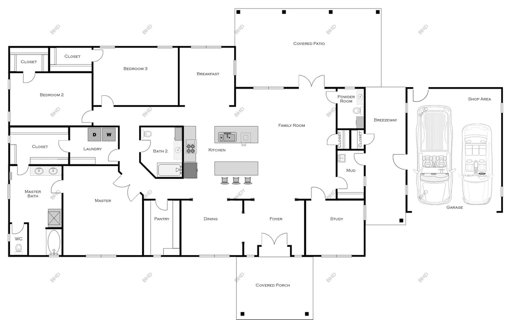 Beautiful single-story, spacious master suite, breezeway & detached garage, and large covered patio. Multiple roof designs available & configurable exterior finishes.