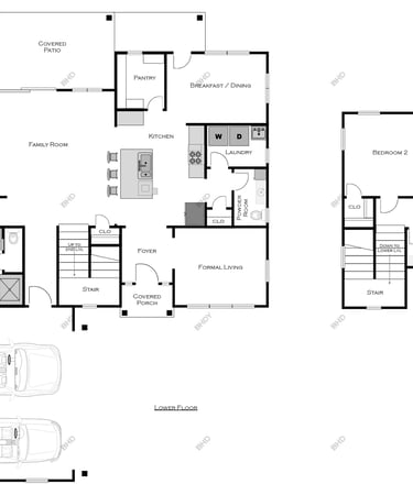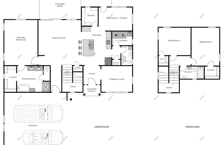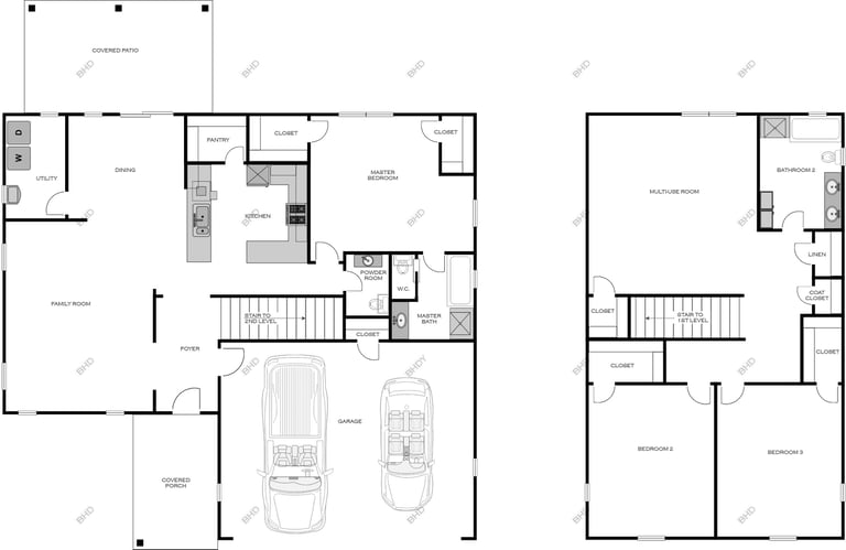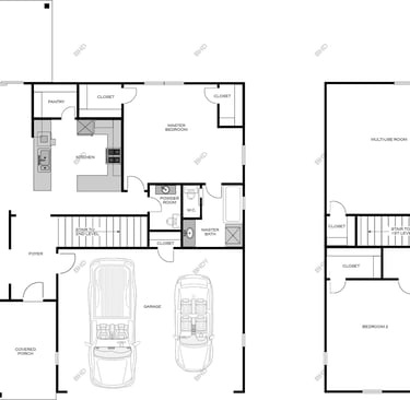 Efficient two-story family home, large multi-use room upstairs, ample storage & covered patio. Multiple roof designs available & configurable exterior finishes.