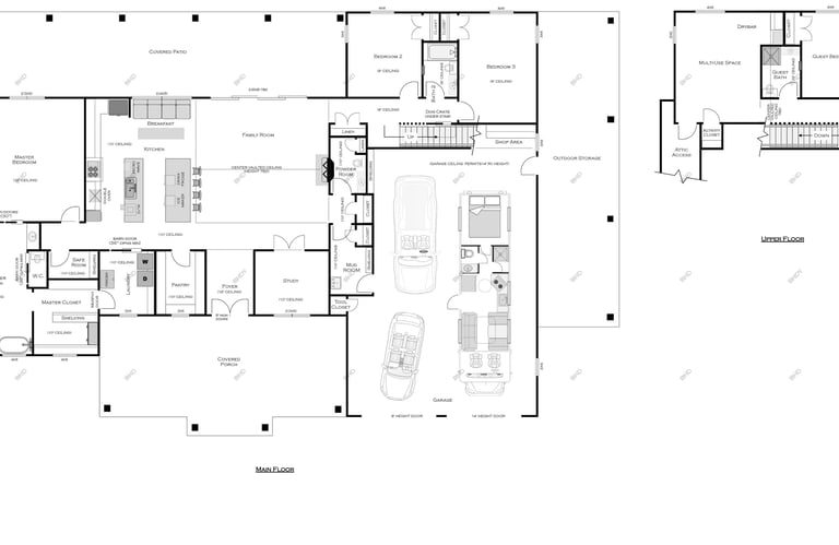 Innovative large single-story, dual island kitchen, two covered patios, and RV garage capability. Multiple roof designs available & configurable exterior finishes.